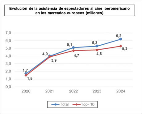 El cine iberoamericano es un valor al alza en Europa, donde el número de estrenos cinematográficos en los países de la muestra han pasado de los 208 en 2023, a los 247 en 2024. Y también esto mismo se puede contrastar en la evolución de los espectadores europeos de cine iberoamericano. Donde se produce un incremento progresivo desde el año de la pandemia hasta finales del periodo analizado.