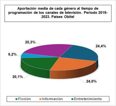 Pero no todo es cine, y en la ficción se sigue poniendo de manifiesto su importancia y peso en la programación de los canales de televisión. En el periodo 2019-2023 la ficción supuso el 24,4%, los programas informativos el 24% y los programas de entretenimiento representan el 20,1% del tiempo total de difusión de contenidos en los canales iberoamericanos analizado.
