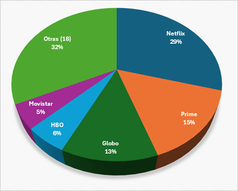Y si hablamos de plataformas VoD, estás pusieron a disposición de los usuarios más títulos de ficción nacional iberoamericana son Netflix (EE. UU.), Prime (EE. UU.), Globo Play (Brasil), HBO (EE. UU.) y Movistar (España). Las cinco plataformas en conjunto sumaron casi el 70% de los títulos totales disponibles durante el periodo 2019-2023.